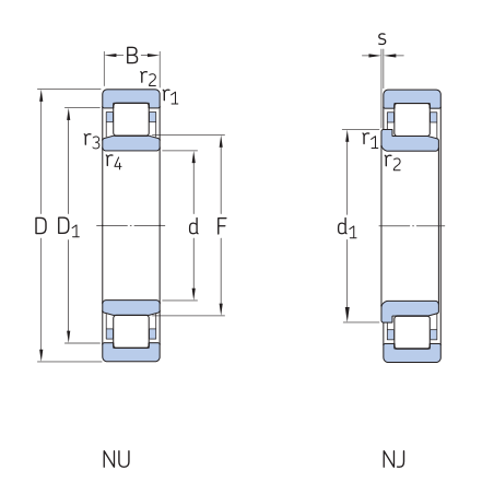 滚动体与套圈挡边摩擦小,适于高速旋转。根据套圈有无挡边,可以分有NU、NJ、NUP、N、NF等单列圆柱滚子轴承,及NNU、NN等双列圆柱滚子轴承。该轴承是内圈、外圈可分离的结构。内圈或外圈无挡边的圆柱滚子轴承,其内圈和外圈可以向轴向作相对移动,所以可以作为自由端轴承使用。在内圈和外圈的某一侧有双挡边,另一侧的套圈有单个挡边的圆柱滚子轴承,可以承受一定程度的一个方向轴向负荷。一般使用钢板冲压保持架,或铜合金车制实体保持架。但也有一部分使用聚酰胺成形保持架。